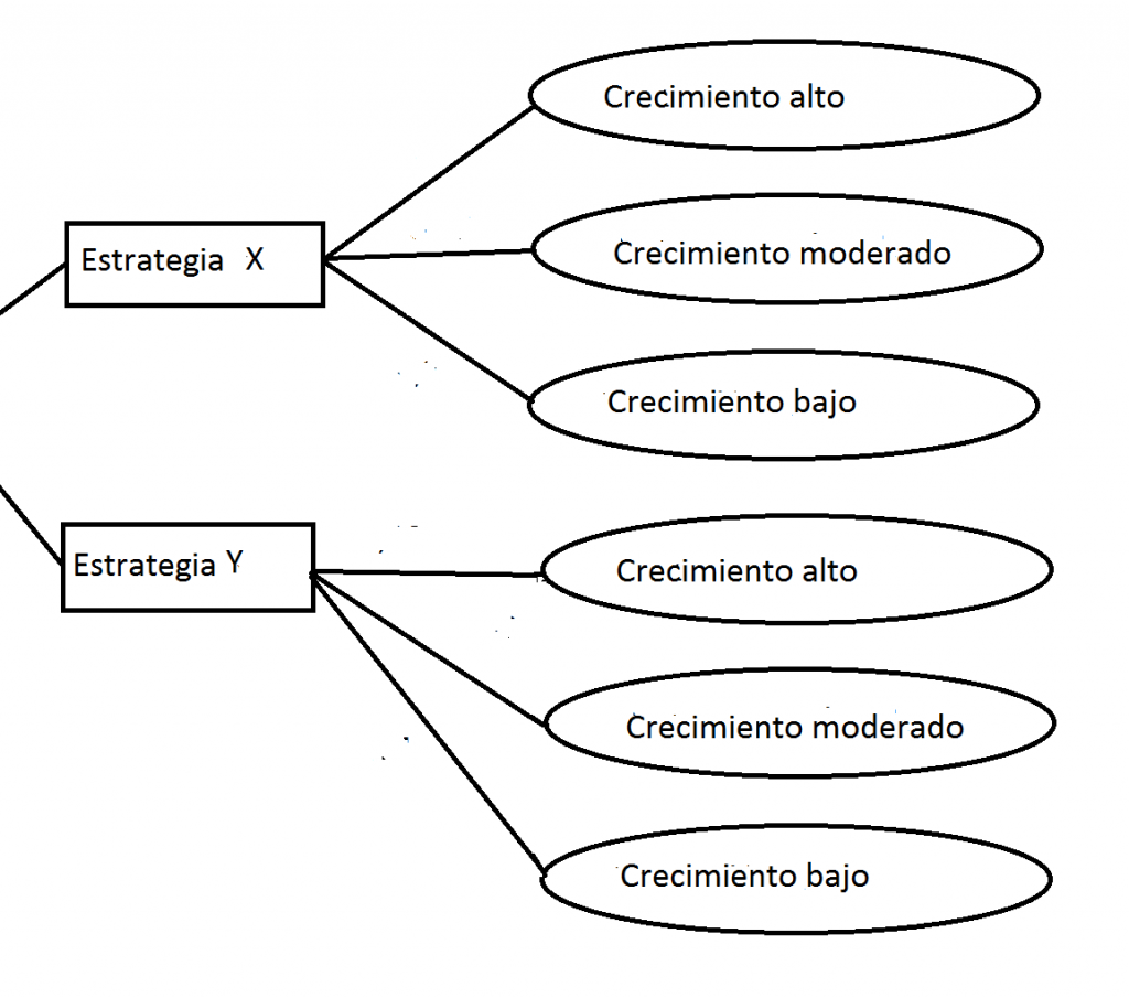 - Nudos aleatorios: Son circunstancias que dependen de factores externos, y no solo de la voluntad del agente. Es decir, no se pueden controlar. Por ejemplo, imaginemos tres escenarios a futuro para la demanda de un producto: Optimista, moderado y pesimista. Entonces, a cada uno se la asigna una probabilidad de ocurrencia diferente, teniendo que sumar dichos porcentajes cuya suma es siempre uno.