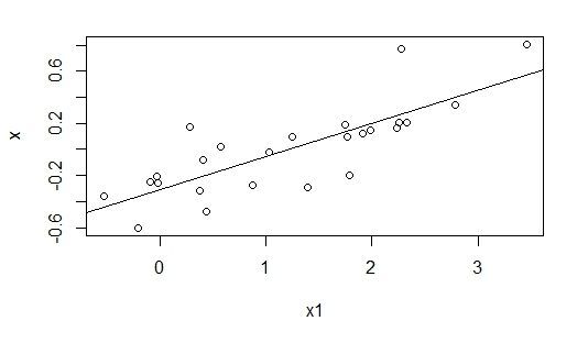 Además, al realizar un modelo de regresión lineal que explique el valor de x conforme el de x1, obtenemos la línea de regresión presente en el gráfico. Esta indica un R cuadrado de 0,62, es decir, x1 es capaz de explicar el 62% de las variaciones de x.