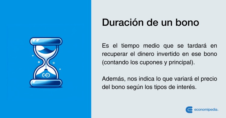 La duración de un bono indica cuánto tiempo tarda un inversor en recuperar su inversión, teniendo en cuenta todos los flujos de caja del bono: los cupones periódicos y la devolución del principal al vencimiento.