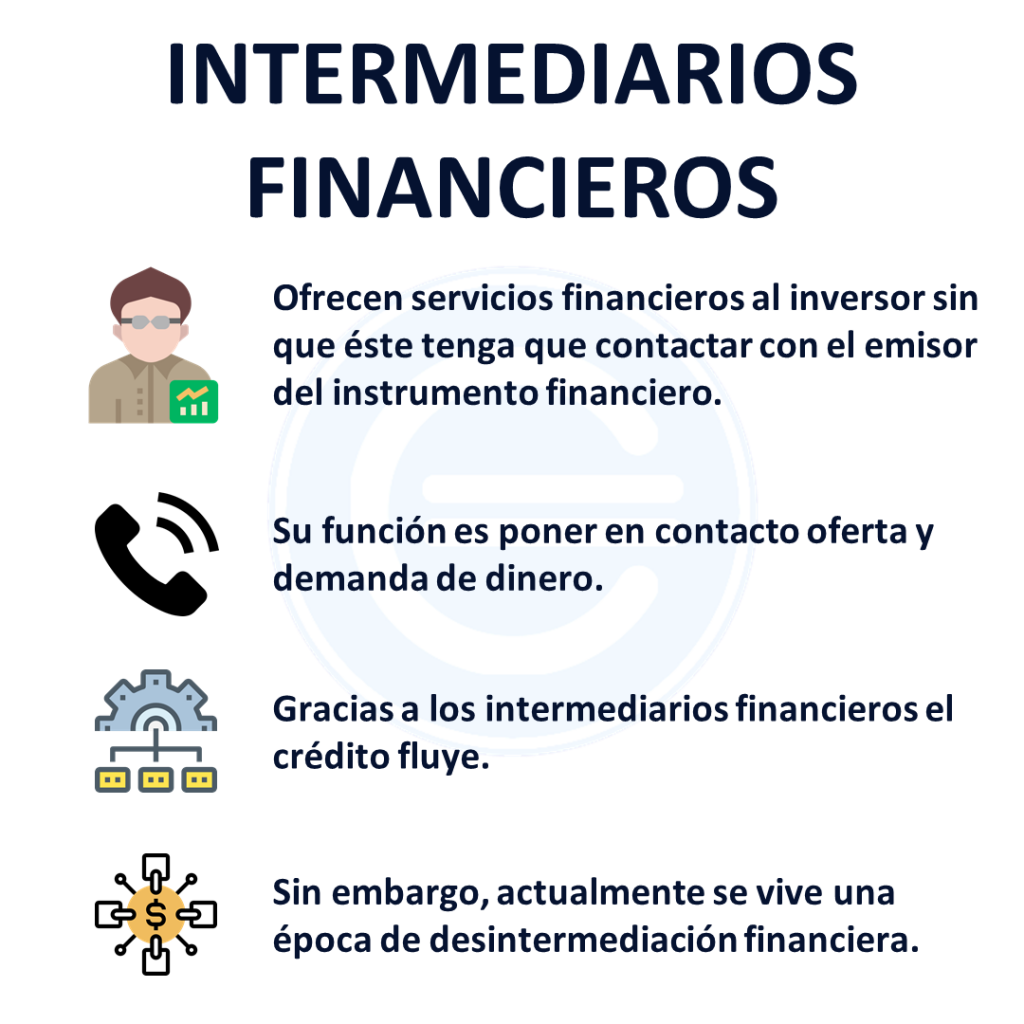 Los Intermediarios financieros son aquellas personas o empresas que ofrecen servicios financieros al inversor sin que este tenga que contactar con el emisor del instrumento financiero.