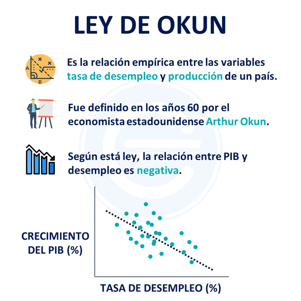 Según establece la definición de la ley de Okun, la relación lineal planteada entre PIB real y tasa de desempleo y sus variaciones porcentuales es necesariamente negativa. A grandes rasgos, este concepto señala que las economías en situación de crecimiento o expansión y una población activa estable tienen que aumentar su número de trabajadores y así hacer crecer su nivel de producción, lo que haría bajar los datos de paro. Por el contrario, en momentos de recesión económica, bajará la cantidad de trabajadores.