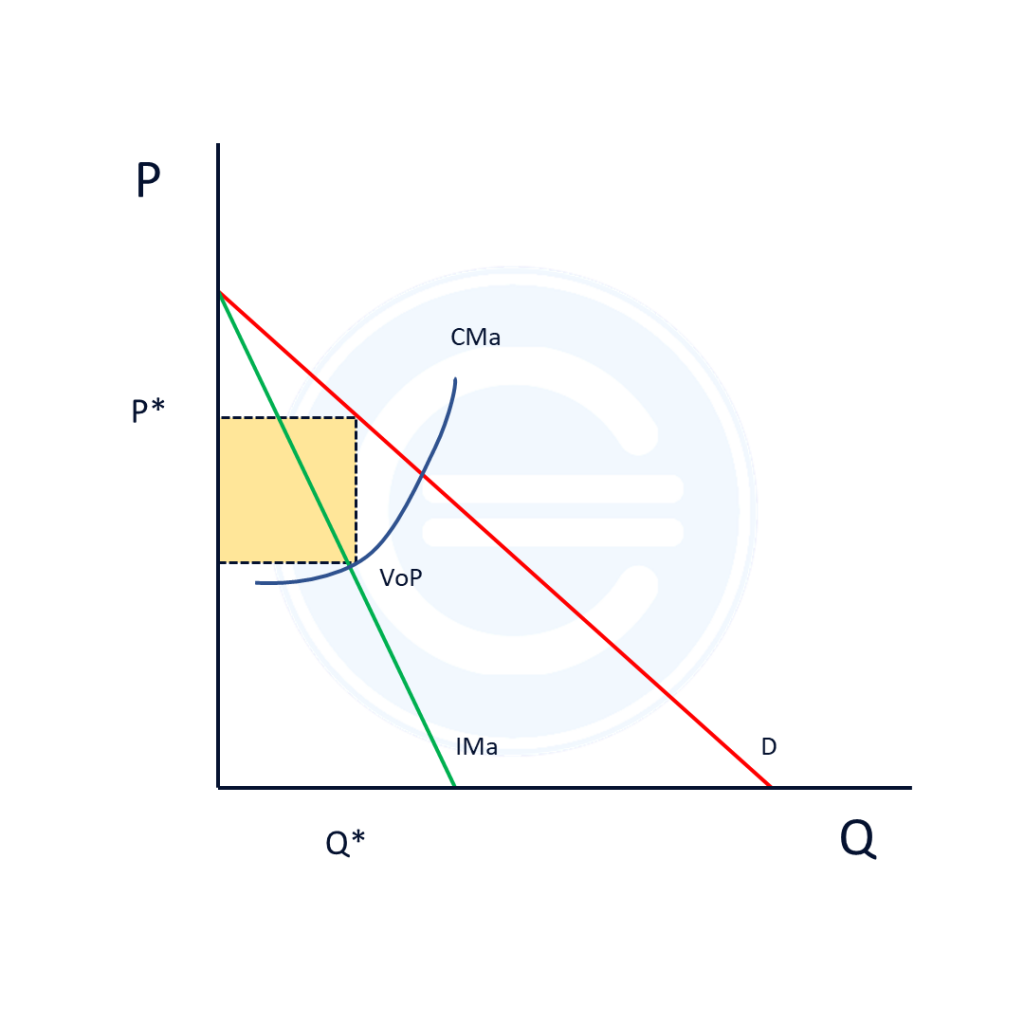 Podemos darnos cuenta de que el volumen óptimo de producción (VoP) o el punto donde se maximizan las utilidades coincide donde se intercepta el IMa y CMa. Sin embargo, el monopolio puro puede vender a un precio superior, porque tiene el control de la oferta. El recuadro amarillo es la ganancia monopolística. Distinto a los pequeños productores que no tienen poder en el mercado, el monopolista puede vender su producto a un precio que es mayor o superior a su costo marginal.