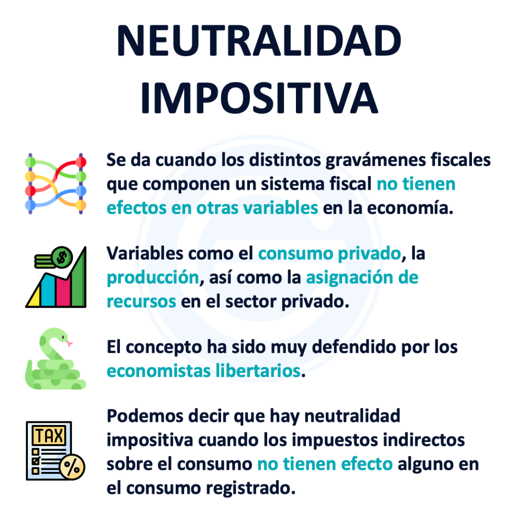 La neutralidad impositiva, por tanto, es la característica con la que puede contar, o no, un sistema fiscal determinado. Esta característica se pone de manifiesto cuando los distintos gravámenes fiscales que componen dicho sistema fiscal no tienen efectos en otras variables en la economía.
