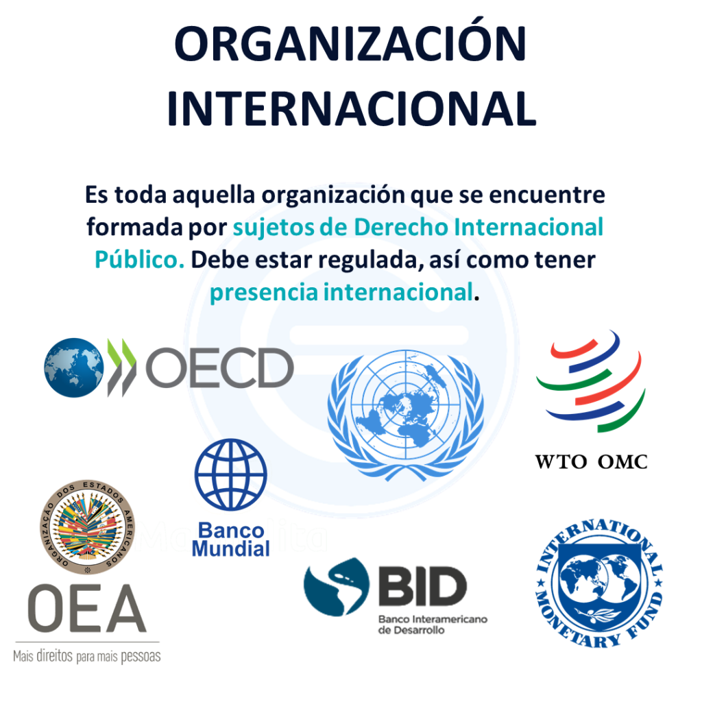 Una organización internacional, como la define la ley, hace referencia a toda organización que se encuentre formada por sujetos de Derecho Internacional Público. Esta debe estar regulada, así como tener presencia internacional.