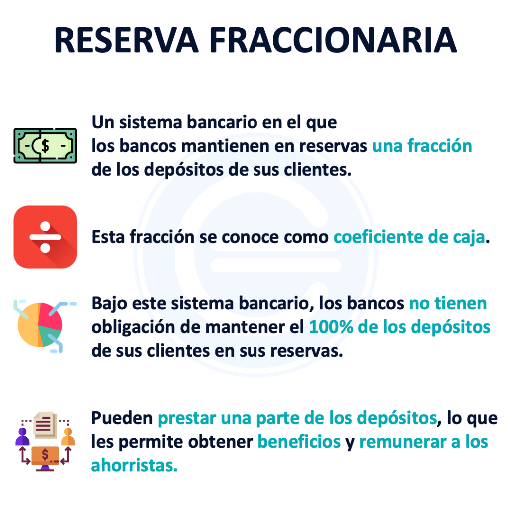 La reserva fraccionaria es un sistema basado en el hecho de que los bancos poseen una pequeña parte del dinero de sus depositantes, presuponiendo que no existirá una demanda conjunta de depositantes que reclamarán todo su dinero al mismo tiempo.