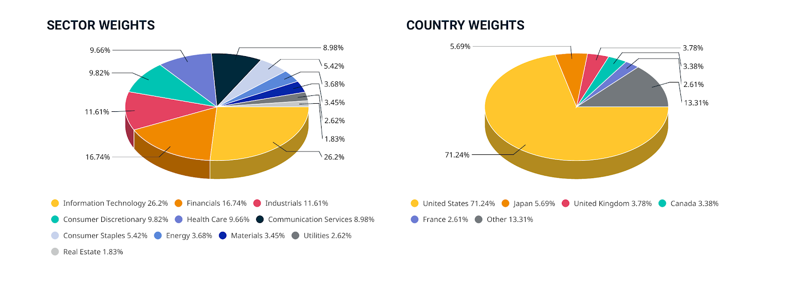 El MSCI World tiene una fuerte presencia de Estados Unidos, que actualmente pesa un 71,24% del índice. El resto se reparte entre Japón, Reino Unido, Canadá, Francia y otros países desarrollados.