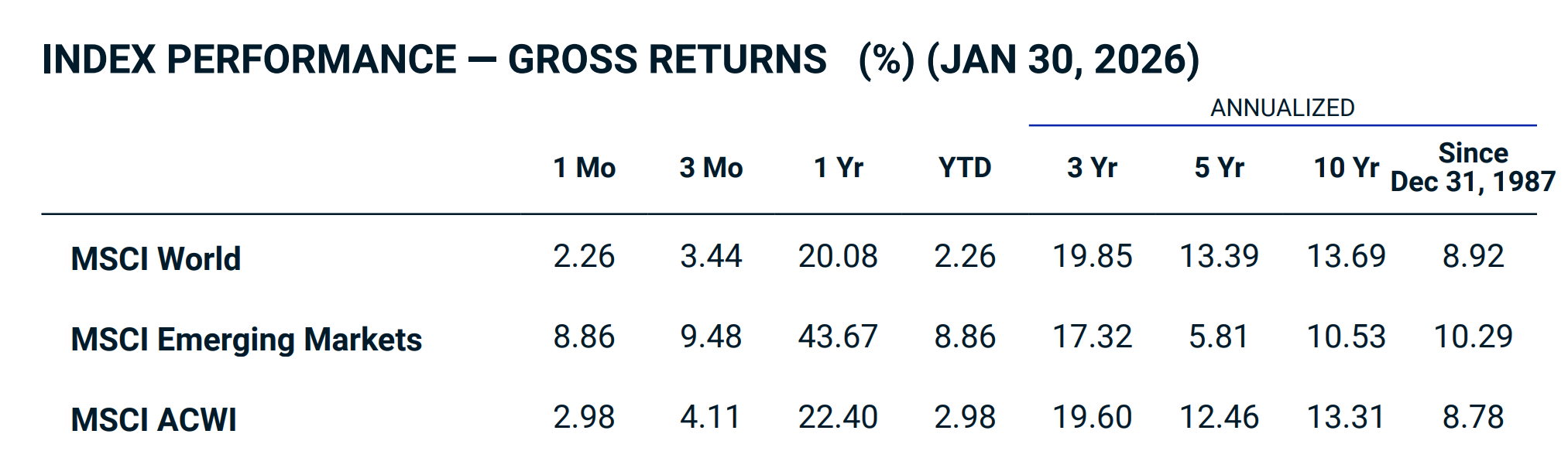 Distribución por sectores y países. Fuente: MSCI, enero 2026