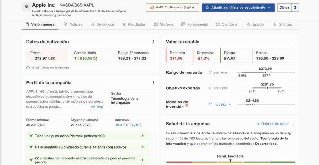 - Aplicar tu Estrategia: Puedes decirle a la plataforma: «Busca todas las empresas globales que tengan un P/E (PER) bajo, un crecimiento de beneficios superior al 15% y que, además, tengan una Puntuación de Salud Financiera excelente». ¡Y te las muestra en un listado!
