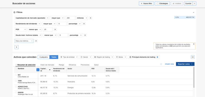 - Temáticas de Inversión: Listas preparadas como «Dividend Champions» (empresas que siempre suben dividendo) .