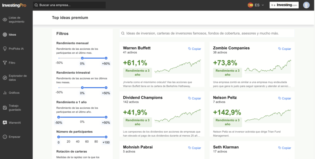 - Filtros Rápidos: A la izquierda tienes unos deslizadores para filtrar estas ideas por rendimiento, rotación de cartera o número de activos.