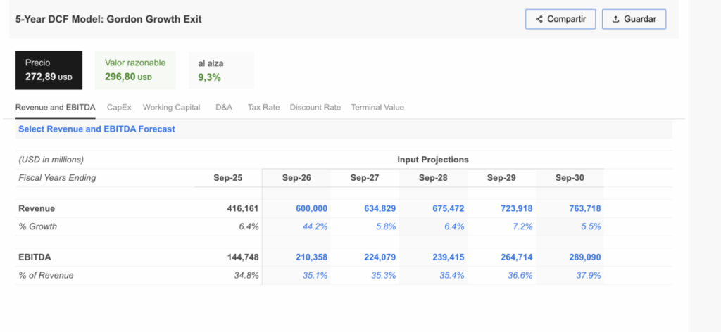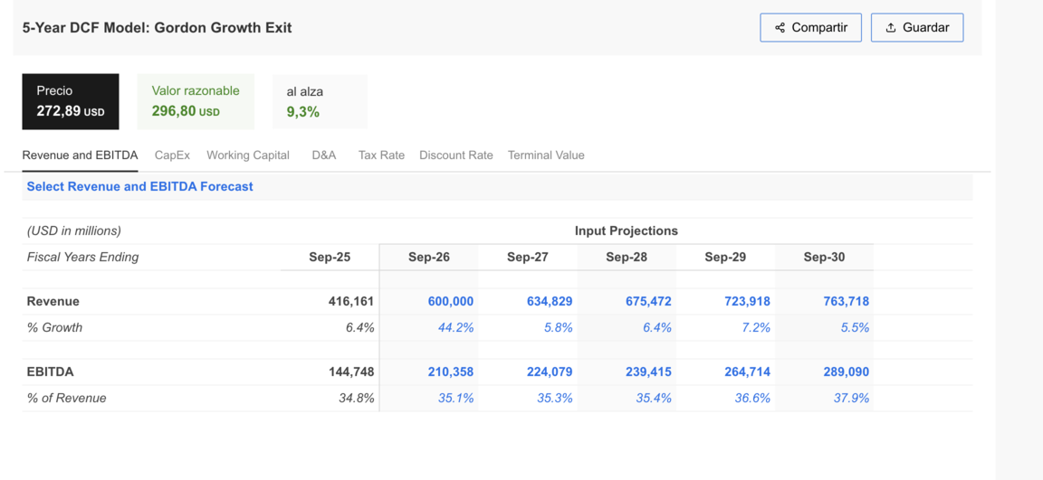 Por ejemplo, la estimación de mercado es que Apple tenga unos ingresos en 2026 de 450.000 millones. Yo he puesto que creo que va a tener 600.000 (es un ejemplo, no pienso esto de verdad).